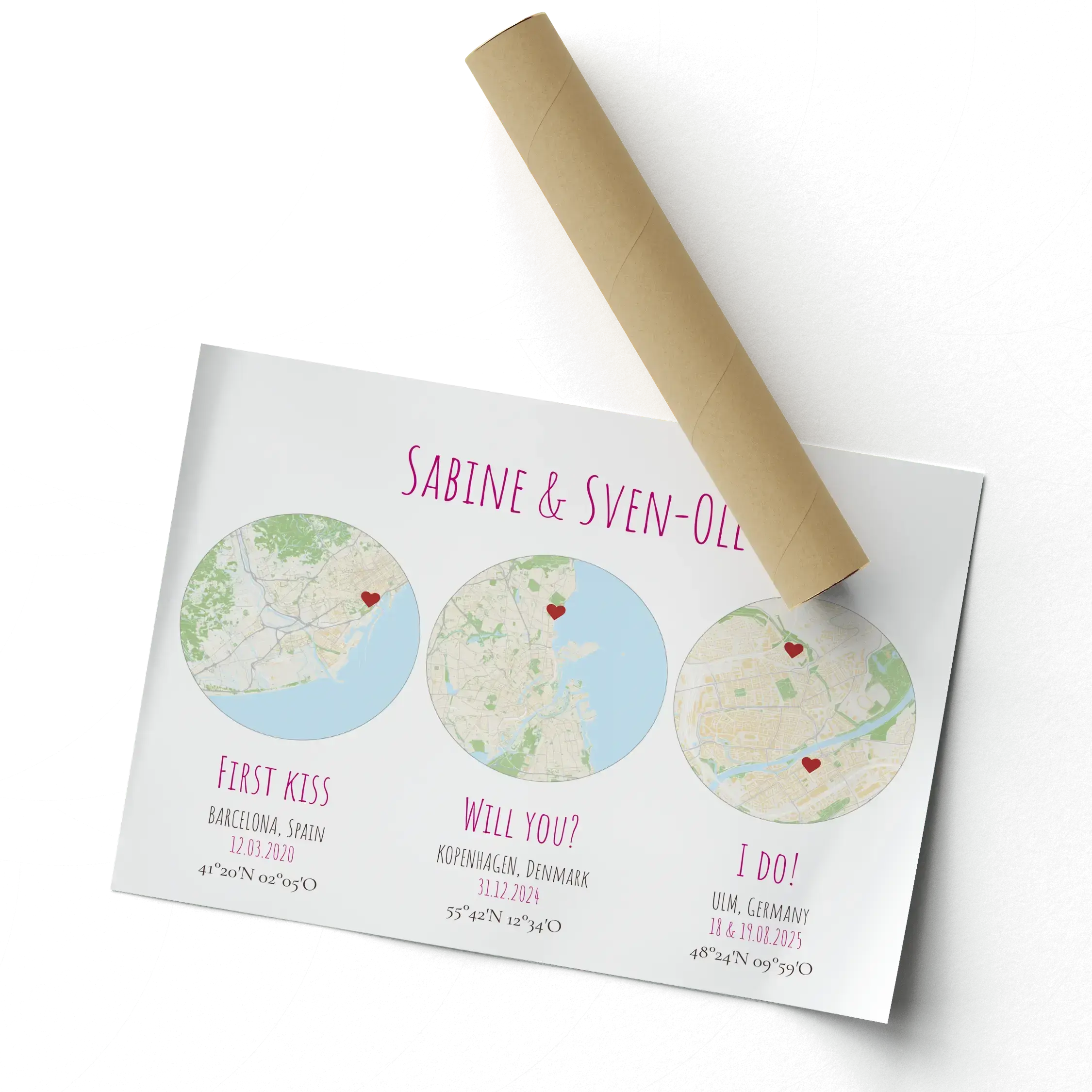 3 ronde stadskaarten – ontwerp jullie liefdesposter met namen, datum & coördinaten